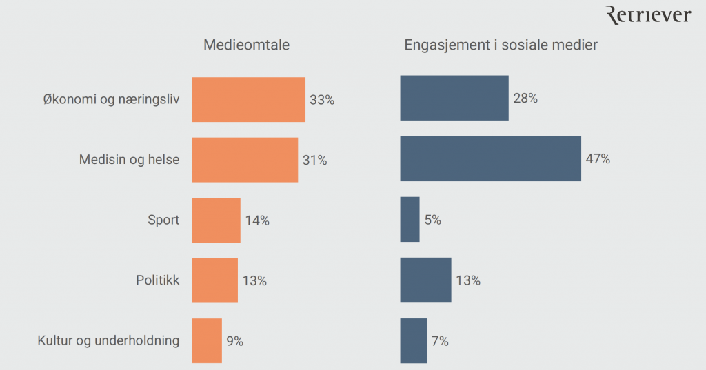 Koronasituasjonen har påvirket flere forskjellige bransjer på ulike vis, enten det handler om økonomi, kapasiteten på sykehusene, avlyste konserter eller smittespredning. Grafen nedenfor til venstre viser omtale fordelt på de fem største temaene i antall medieoppslag. Øverst på listen ser vi økonomi og næringsliv, tett etterfulgt av medisin og helse. Deretter har vi sett på engasjementet blant folk i sosiale medier. Det har vi sett på ved å se på antall reaksjoner, kommentarer og delinger på nettartikler på Facebook. Omtale som knytter seg til medisin og helse har skapt flest interaksjoner, og ligger øverst på listen med 47 prosent.