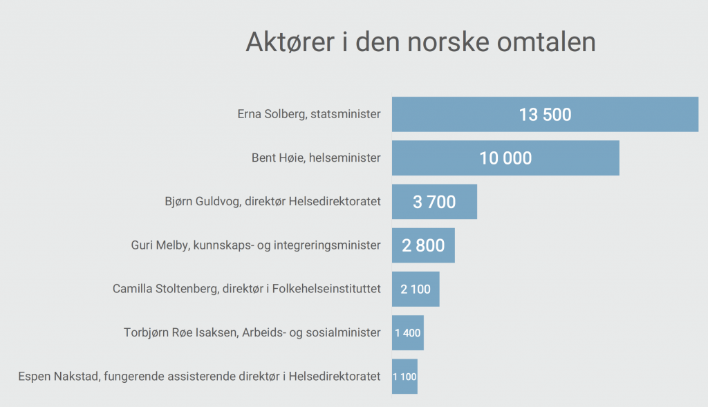 Vi har også sett nærmere på hvilke aktører som har vært mest omtalt i forbindelse med korona i Norge for i år. Øverst på topplisten finner vi statsminister Erna Solberg, med 13 500 medieoppslag. Helseminister Bent Høie med 10 000 oppslag kommer på andre plass, mens på tredje plass finner vi direktør i Helsedirektoratet, Bjørn Guldvog, med 3700 oppslag.