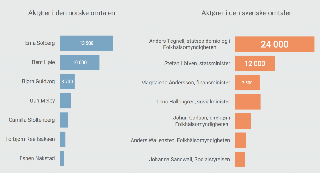 Et av funnene som illustrerer forskjellen i den norske og svenske koronastrategien handler om hvilke aktører som er mest synlig i omtalen. Derfor har vi sammenlignet de norske aktørene med aktører i Sverige. Det publiseres flere oppslag i Sverige generelt og også knyttet til korona sammenlignet med Norge. I Svergie ser vi at det er statsepidemiolog Anders Tegnell, som ligger øverst på listen. Han er omtalt i dobbelt så mange medieoppslag som statsministeren Stefan Löfven. Disse tallene kan gjenspeile at Erna Solberg har vært en tydeligere leder i Norge når det gjelder tilstedeværelse i mediene. Analysen viser at Norge og Sverige har valgt ulike strategier.