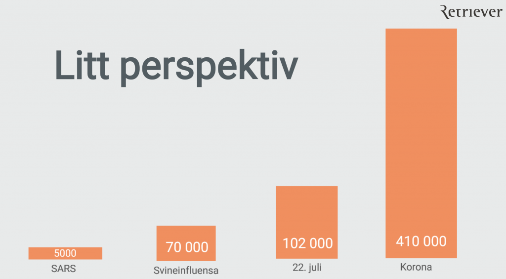 Vi har sett på SARS-utbruddet, svineinfluensaen og 22. juli-terroren. For SARS i 2002 og 2003 finner vi 5000 medieoppslag. Svineinfluensaen i 2009 og 2010 ga 70 000 medieoppslag. For 22. juli har vi sett på perioden fra 22. juli og frem til 22. oktober i 2011, og da fant vi 102.000 medieoppslag. Men 22. juli er også blitt mye omtalt i etterkant, og totalt siden 2011 og frem til i dag finner vi 450.000 medieoppslag.