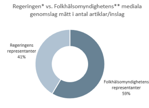 Jämför vi medieutrymmet för några av Folkhälsomyndighetens och regeringens representanter sammanslaget i coronafrågan blir genomslaget något mer jämnt. Artiklar om Folkhälsomyndighetens representanter Anders Tegnell, t.f statsepidemiolog Anders Wallensten och generaldirektör Johan Carlson utgör 59 procent medan artiklar om statsminister Stefan Löfven, socialminister Lena Hallengren, finansminister Magdalena Andersson och näringsminister Ibrahim Baylan i coronafrågan utgör 41 procent.