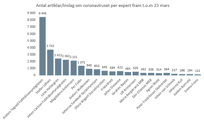 Av alla experter som uttalat sig i media om coronaviruset är Anders Tegnell den i särklass mest omskrivna, totalt i över 8 400 redaktionella artiklar och inslag i svensk media. Det är mer än dubbelt så mycket som statsminister Stefan Löfven.