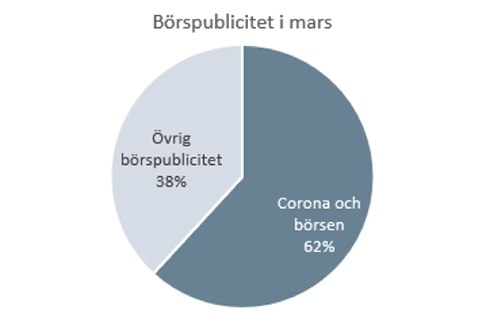 I mars har coronanyheter dominerat börsrapporteringen då över 60 procent av alla börsartiklar nämnt krisen. Totalt har 15 000 redaktionella artiklar och inslag om börsnyheter kopplat till corona publicerats i svensk media.