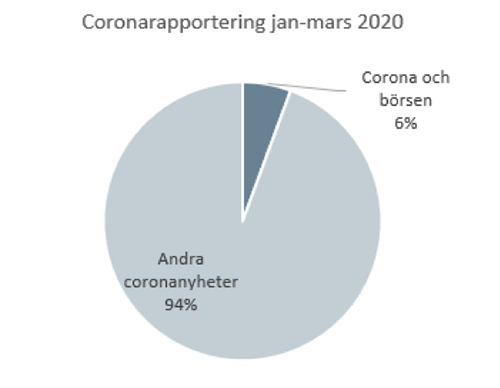 Sen i januari har över 246 000 redaktionella artiklar och inslag publicerats om coronaviruset i svensk media. Av dessa är 6 procent en börsnyhet. Rapporteringen om corona och börsen stack tidigt ut i och med pandemins start i Kina som är en viktig ekonomisk marknad. Att börsnyheter tidigt tog stor plats i nyhetsrapporteringen om corona var tydligt eftersom Dagens industri inledningsvis var den källa som rapporterade mest om coronaviruset. Nu mot slutet av mars när viruset påverkar så gott som alla samhällets delar är det i stället Sveriges Radio och Svenska Dagbladet som rapporterat mest om covid-19.