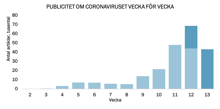 Coronarapporteringen i Sverige uppgår nu till 222 000 redaktionella artiklar och inslag sen starten i januari.