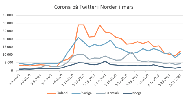 Bara i Sverige har det postats över 360 000 tweets om coronaviruset den senaste månaden. Även i de andra nordiska grannländerna har twitteraktiviteten varit hög i mars. Flest inlägg om corona har gjorts i Finland, följt av Sverige, Danmark och Norge.