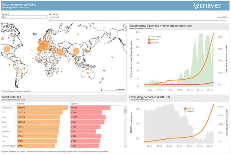 Vi har utvecklat en interaktiv dashboard som ger våra kunder en snabb och kontinuerlig översikt över all medietäckning relaterad till coronaviruset Covid-19.