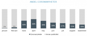 Under årets tredje kvartal har det publicerats nära 400 000 artiklar och inslag om coronakrisen i svenska redaktionella medier.