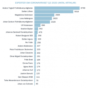 Precis som tidigare under året är det Folkhälsomyndigheten och statsepidemiolog Anders Tegnell som är de mest utmärkande aktörerna i publiciteten om corona. Nytt för tredje kvartalet är dock att regeringens representanter för första gången får större utrymme i coronafrågan än Folkhälsomyndighetens representanter. Det beror främst på att omnämnanden av Anders Tegnell minskar, snarare än att regeringen ökar.