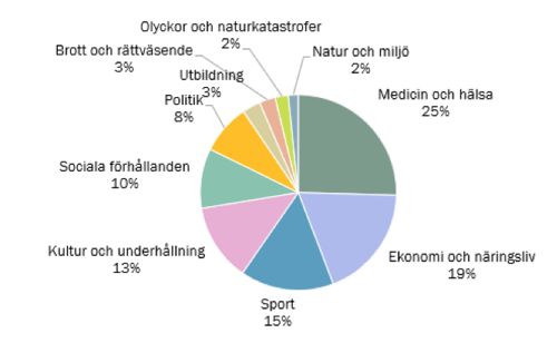 Det största ämnet i coronarapporteringen i Q3 är medicin och hälsa, följt av ekonomi och näringsliv. Sport har ökat något under kvartalet, ekonomi och näringsliv har minskat något.