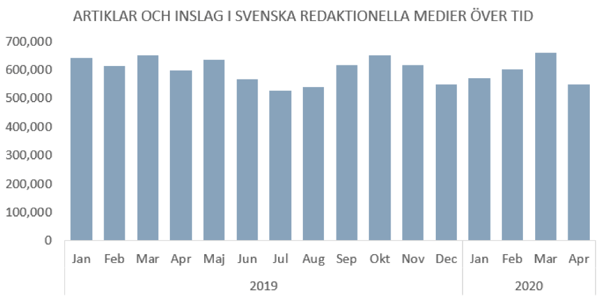 Trots att corona tar upp en större andel av medieutrymmet i april ligger antalet artiklar om viruset i linje med mars. För corona till trots har april varit en relativt mediefattig period, med färre artiklar än en genomsnittlig månad sett till det senaste 1,5 året. Kanske är det så att samhällets "tillfälliga paus", med inställda konserter, sportevenemang och nedstängda verksamheter lett till en viss nyhetstorka, bortsett corona. Under de två senaste månaderna är det få händelser utöver coronarelaterade som skapat någon större uppmärksamhet eller engagemang i media. De flesta händelser som fått något betydande genomslag hände strax innan corona slog igenom med kraft i svenska medier. Lex Lilla hjärtat och flyktingsituationen vid den grekisk/turkiska gränsen är exempel på nyheter som fick stor uppmärksamhet både i redaktionella och sociala medier i början av mars. Från mitten av mars är exemplen färre. Finansinspektionens stora bot mot Swedbanks penningtvätt är ett och bortgången av författaren P-O Enquist ett annat.