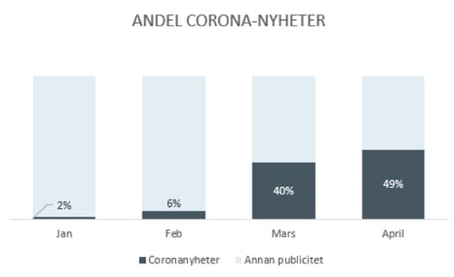 Sedan i januari har coronaviruset omnämnts i nästan en halv miljon artiklar och inslag i svenska redaktionella källor. I mars utgjorde coronanyheter drygt 40 procent av allt som publicerades i media och i april är andelen ännu större då nästan hälften av medieutrymmet har vigts åt nyheter om covid-19. Då ska vi också påminna oss om att ju mer etablerad situationen med corona blir i samhället, desto fler nyheter kan handla om dess effekter utan att faktiskt omnämna virusets namn. Vi kan därför anta att betydligt fler än hälften av alla artiklar och inslag de senaste månaderna har handlat om corona, eller åtminstone dess effekter.
