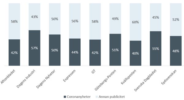 Tittar vi på enskilda källor sticker Dagens industri och Svenska Dagbladet ut då båda tidningarna har vigt betydligt mer än hälften av sina artiklar åt coronanyheter i mars och april, vilket kan förklaras med deras fokus på ekonominyheter. Även nyhetsbyrån TT:s nyheter under mars och april har till nästan 60 procent handlat om corona.
